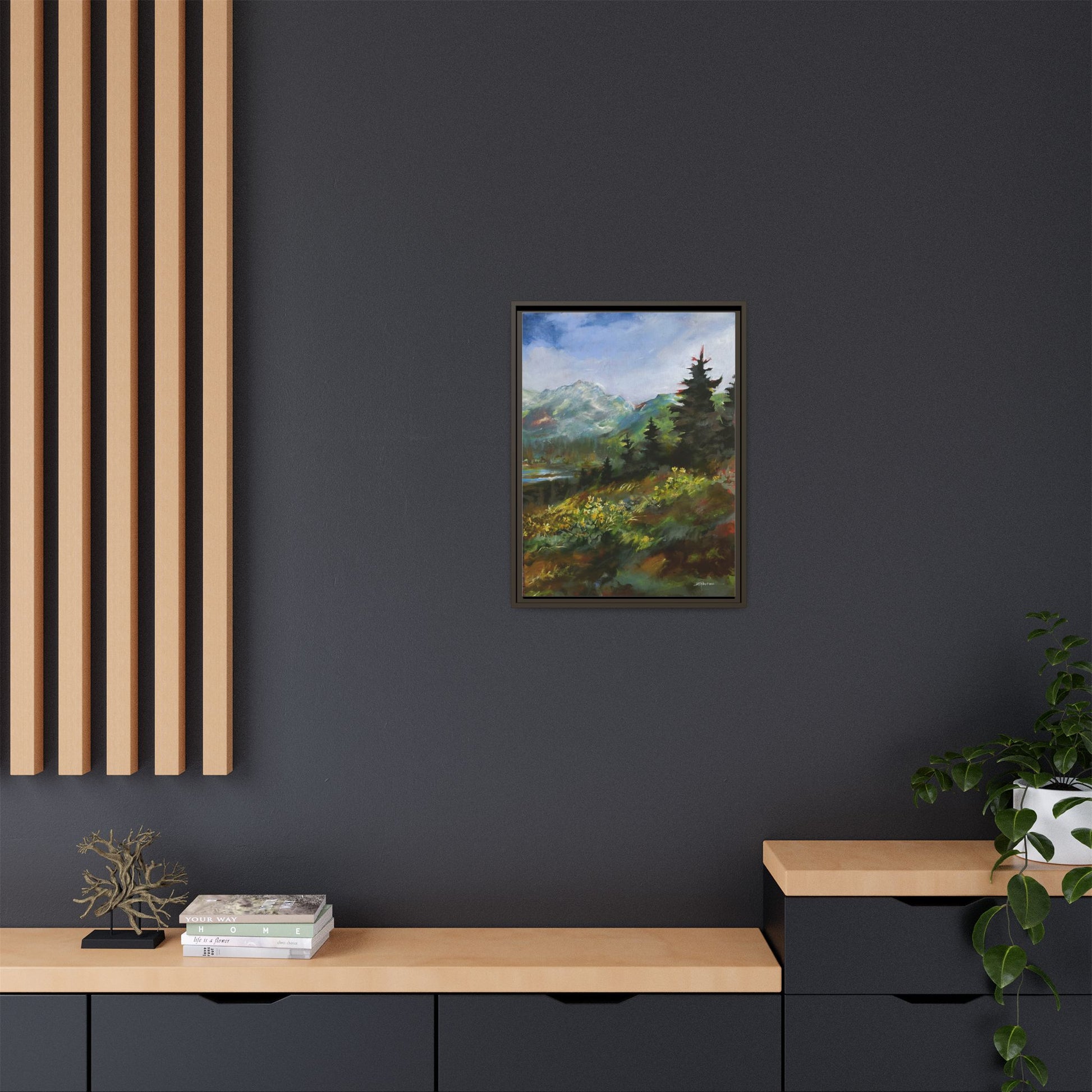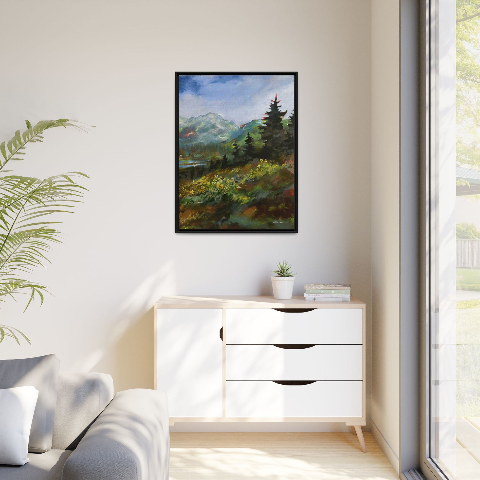 Matte canvas print framed in a sleek pine frame OF DAVID RANDALL'S "SPRING HILL". . The textured canvas surface and advanced latex inks create rich, painterly color with natural depth—clouded blue skies, distant peaks, and evergreen silhouettes feel close enough to step into. Light, sustainable materials and a subtly modern frame make this piece work quietly in a living room, hallway, or cabin nook, adding warmth without overwhelming the space. Hang it horizontally or vertically; the included sawtooth hardware makes installation straightforward. The result is an artful, eco-conscious accent that reads handcrafted but holds up to everyday homes.